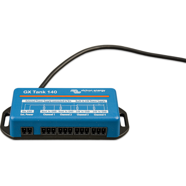 The GX Tank 140 takes readings from up to four tank level sensors. It is an accessory for our range of GX system monitoring products, of which the Cerbo GX is the most commonly used model.