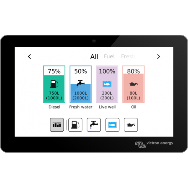 For marine applications, the GX Device can transmit these tank levels on the NMEA 2000 network to be picked up by other displays such as an MFD.